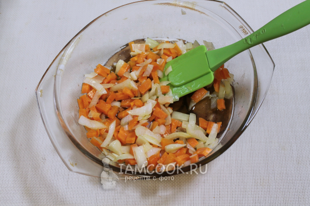 - В посуду для микроволновки налить немного масла и кинуть овощи. Отправить в печь на минуту при всей мощности.