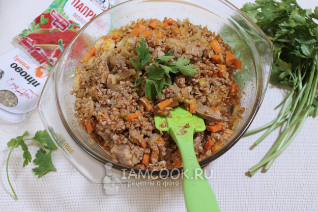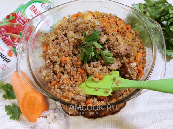 Ингредиенты:свинина – 400гр; гречневая крупа – 250гр; паста томатная – 1ст.л; лук – 1шт; морковь – 1шт; масло растительное – 2ст.л; зелень свежая (петрушка, укроп) – по желанию; соль, молотый черный перец – по вкусу.