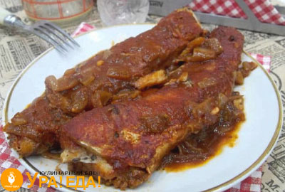 - Во второй сковородке пассируем лук, нарезанный полукольцами до золотистости. На эту луковую подушку выкладываем обжаренную рыбу. Заливаем настоявшимся соусом и включаем сильный нагрев. Когда все закипит, убавляем огонь, закрываем крышкой и тушим примерно 30 минут.