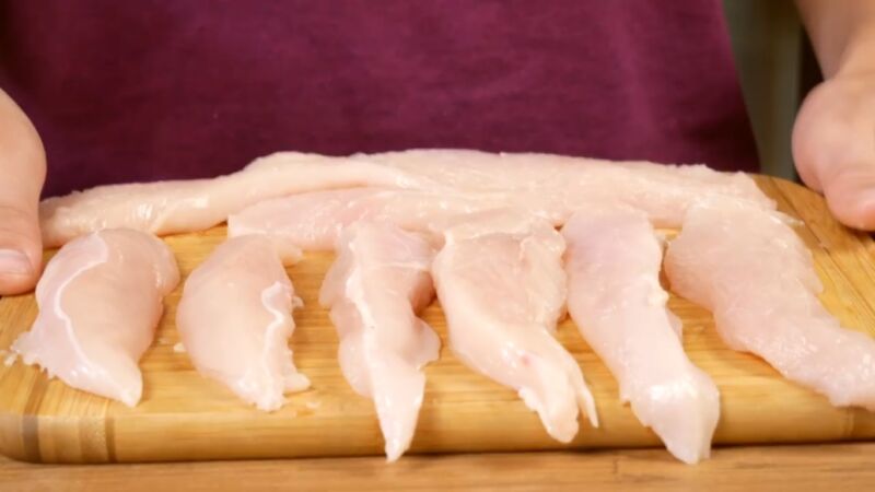Куриное филе промываем под струей воды. Режем на полосы. Если у вас есть молоток для отбивания мяса, отбейте кусочки.