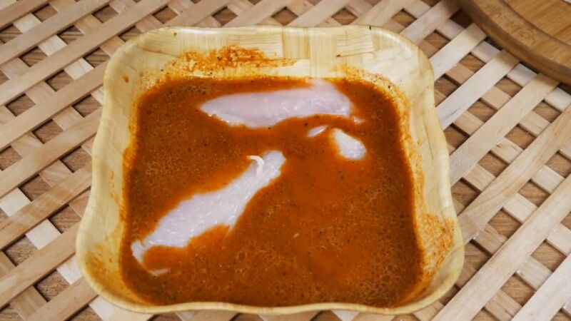 4. Полученный маринад влить в пакет курицей. Перемешивать, пока мясные полоски равномерно не окрасятся. Выдавить из пакета воздух, герметично закрыть или завязать.