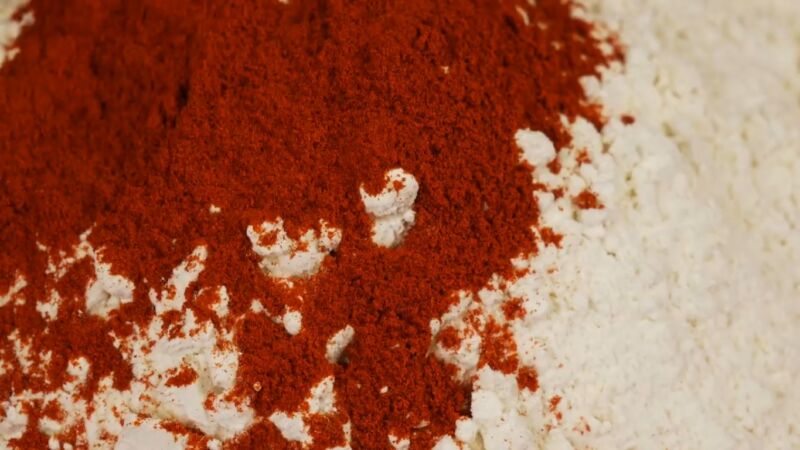 3. Пока у нас появилось свободное время можно подготовить не замысловатую панировку. В широкую посуду насыпьте пшеничную муку и паприку. Перемешайте сухие ингредиенты между собой.