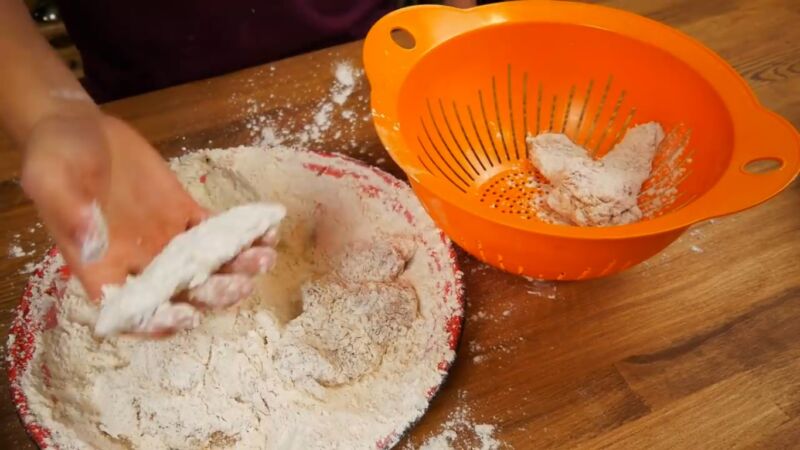 4. По истечении времени маринования достаём мясные кусочки и обваливаем их со всех сторон в смеси из муки и паприки. Затем эти кусочки перекладываем в дуршлаг и хорошенько стряхиваем, чтобы избавиться от лишней панировки.