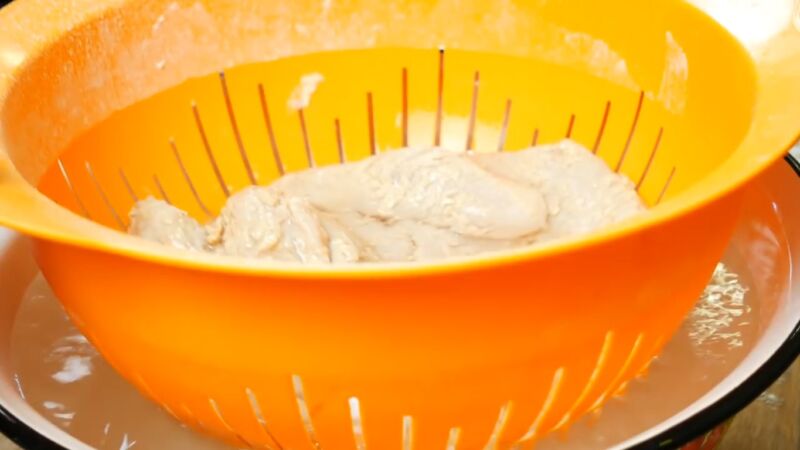 5. Теперь подготовьте глубокую чашку с водой. В неё нужно окунуть нашу курицу в дуршлаге. Продержите её там до тех пор пока все пузырьки воздуха не выдут на поверхность.