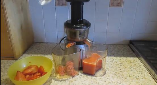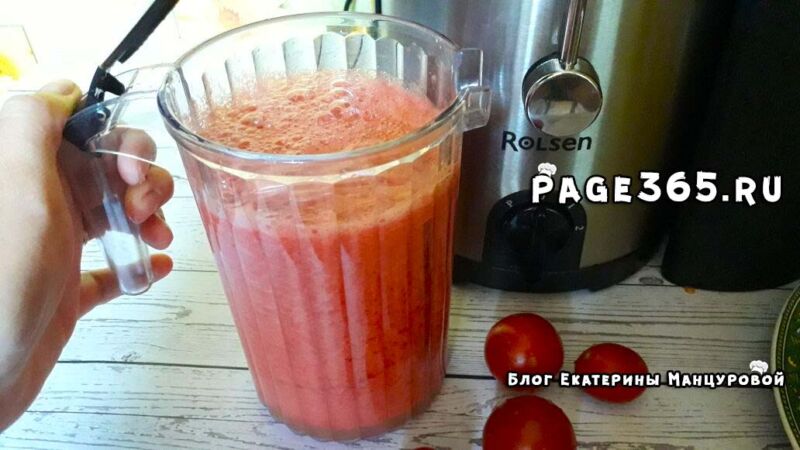 - Затем помидоры нужно перекрутить на соковыжималке.