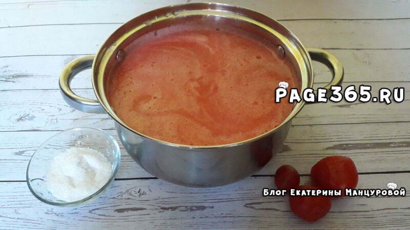 - Полученный помидорный сок вылить в кастрюлю и поставить на огонь.