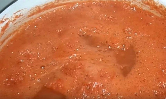 4. Заполняем помидорной массой сотейник и накаляем до закипания. Готовим на малом огне 15 минут. Образующуюся пенку соскребаем лопаткой.