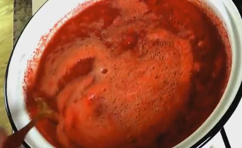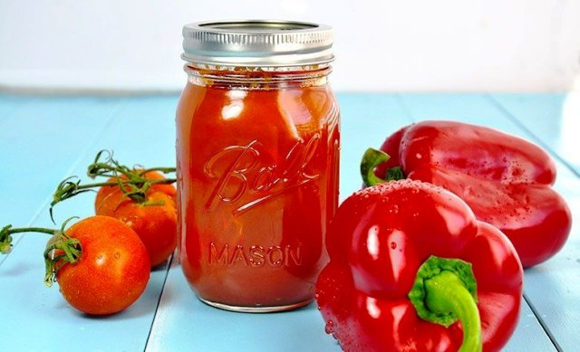 Сварить сок из помидоров на зиму можно заготавливать, добавляя различные овощи. Предлагаю использовать для приготовления рецепт очень вкусного томата с перцем. Сделать такую смесь можно при заготовке сока через мясорубку (шнековую выжималку), добавляя стручки перца вместе с томатами. Соотношение продуктов примерно 5:2 (на 5 кг помидор – 2 кг сладкого перца).