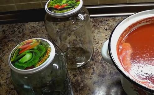 Шаг 4. Перед тем, как залить содержимое соусом, нужно сначала обдать их кипятком. Для этого, ставим кипятиться чистую воду. Затем аккуратно, заливаем банки доверху. Опять-таки, чтобы не треснуло стекло, разливайте по 1 черпаку в каждую емкость по очереди, чтобы температура распределялась равномерно.