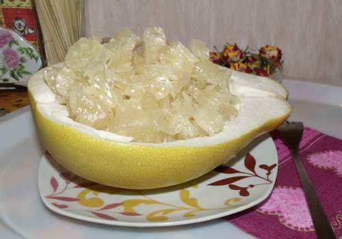 . Помело считается полезной добавкой для несладкой еды. Если нарезать фрукт ломтиками, посыпать сахаром и подать на стол, блюдо потеряет свои полезные и вкусовые свойства. Есть фрукт лучше в свежем виде, очищенным от кожуры и лишних элементов.