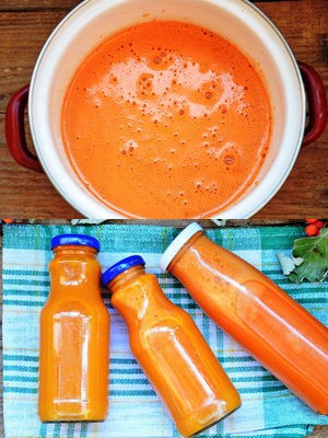 Если нужно приготовить на зиму натуральный морковный сок, можно сделать это в соковарке. Но надо учесть, что поскольку приготовленный таким способ сок имеет высокую концентрацию, перед употреблением его лучше разводить с водой. Как уже было сказано выше, сок получится абсолютно натуральным, поскольку для его заготовки берется только морковь.