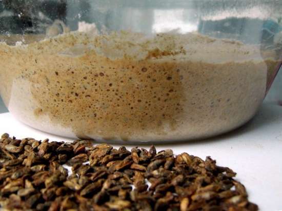 - Измельчить руками полкило ржаного хлеба. Залить его двумя стаканами подогретой воды, добавить пригоршню изюма и три столовые ложки сахара. Поместить смесь в тёплое место для сбраживания. По истечении суток жидкость процедить, а хлеб отжать. В полученный настой всыпать муку в таком количестве, чтобы смесь напоминала по консистенции сметану. Через два-три часа продукт готов к употреблению.