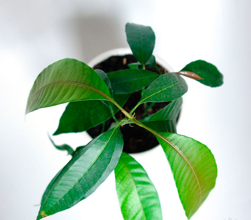 Листики манго начнут появляться через 2–4 недели. Некоторые из них будут окрашены в ярко-зелёный, а другие в фиолетовый. Не стоит пугаться, это всего лишь особенность культуры.