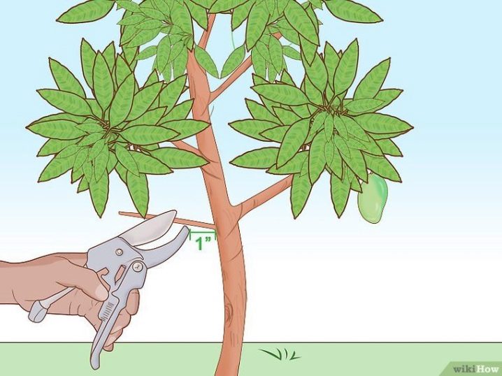Это деревце вполне нормально переносит процедуру обрезки, поэтому сформовать крону можно так, как вам захочется. В том случае, если манго будет расти постоянно в комнате, и высаживать в открытый грунт вы его не собираетесь, ему обязательно понадобятся систематические обрезки. Когда оно дорастет до метровой высоты, необходимо начать прищипку верхних пар листьев, и удалять их следует вместе с почками.