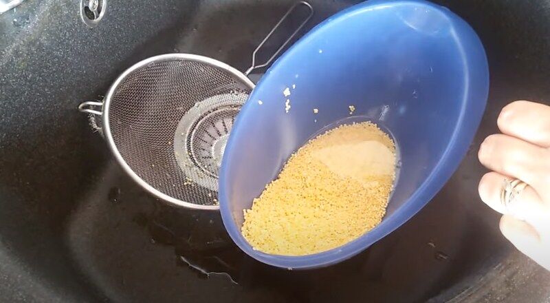 В первую очередь внимательно переберите пшено. Имеющийся мусор удалите (если таковой есть), выложите крупу в мелкое сито, промойте пшено, так чтобы вода стала абсолютно прозрачной.