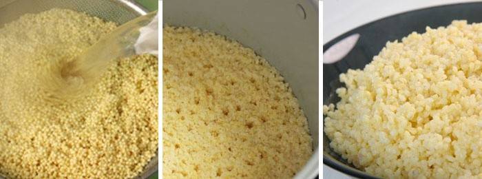Пшенную крупу моем в прохладной воде, меняя ее несколько раз.