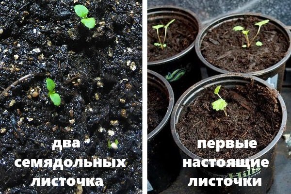Всходы появляются примерно через две недели. Тут уже нужно поставить ящик на свет. Ещё через неделю вырастает первый настоящий лист. После появления 2-3 настоящих листочков растения можно рассаживать в отдельные горшочки. Землю берем ту же, а на дно для дренажа насыпаем керамзит или крупный песок и т.п. За несколько дней до высадки рассаду можно продезинфицировать пролив светлым теплым раствором марганцовки.