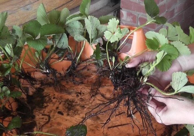 - Взять горшок с подготовленным грунтом. В почве проделать небольшое углубление, после чего поместить в него корни земляники так, чтобы они не загнулись вверх. Сердцевина растения должна находиться над землей.