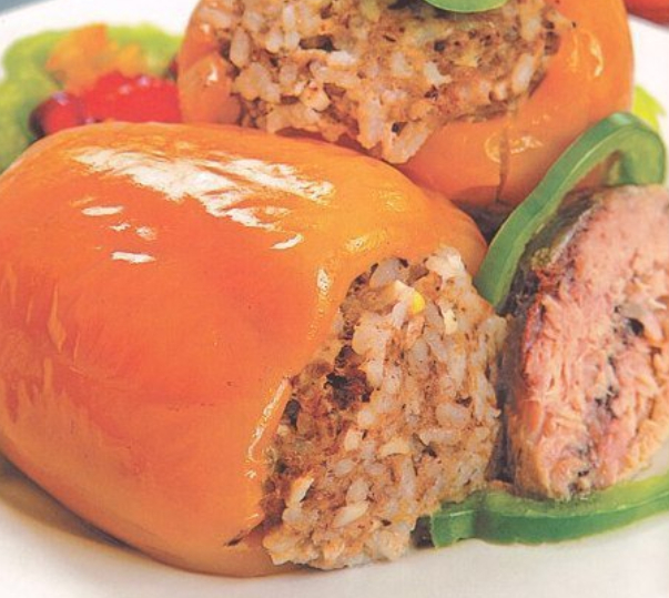 Перечень продуктов, входящих в рецепт: 4 болгарских перца среднего размера, 200 г риса, 0,5 кг фарша кета, 1 морковь и луковица, 3 ст. л. сметаны, 2 ст. л. томатной пасты, вода, соль, специи.
