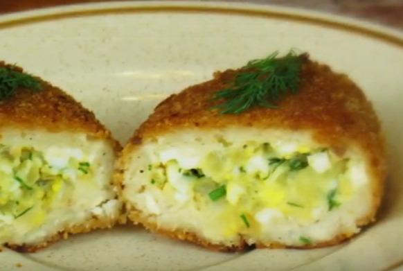Необходимые продукты: 100 г круглозерного риса, 2 куриных яйца (для начинки и фарша), 100-150 г тертого сыра (гауда, голландский), 0,5 кг рыбного фарша, 1 луковица, соль, перец.