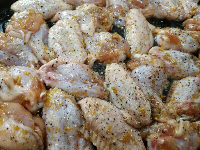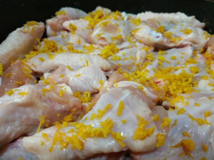 Подготовим крылышки и посыпаем цедрой апельсина. Буквально 1 столовая ложка, как показано на фото: