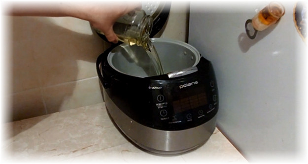 Предварительно необходимо разогреть растительный масло для обжарки. Влить нужное количество в чашу мультиварки и выставить ее в режим “Жарка” на полчаса или “Мультиповар” на максимальную температуру.