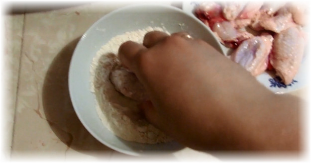 7. Сразу обмакивают в крахмал с обеих сторон. Лишний крахмал отряхивают. Подготовленные крылышки выкладывают на тарелку. Но можно выполнять эти действия непосредственно перед погружением в кипящее масло.