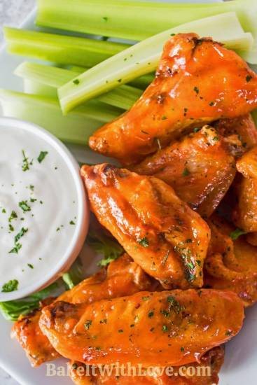 Мне нравится служить своим крыльям с хрустящими стеблями сельдерея и соус Ранч or соус из голубого сыраили салат из салата айсберг, нарезанных кубиками помидоров и раскрошенного бекона с соусом из ранчо или голубого сыра. Наслаждаться!