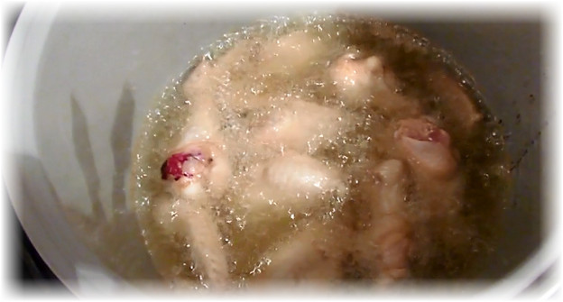 Шаг 5. Сразу после шага 4, окунаем крылышки в раскаленное масло, на 7-10 минут. При этом масло должно полностью скрывать курочку.
