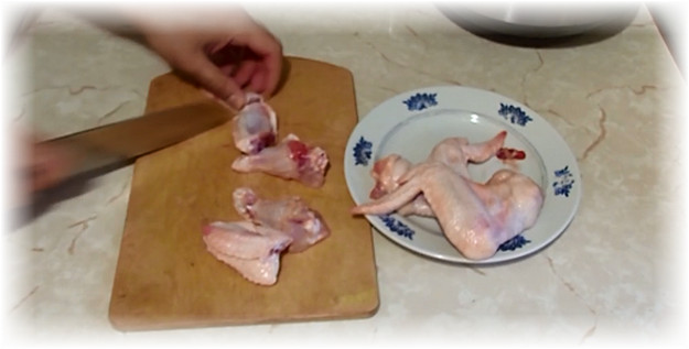 За то время, что нагревается масло, надо успеть подготовить мясо. Крылья обобрать от остатков перьев, а если требуется, то осмолить волоски. Потом их обмыть и обсушить. Каждое крыло разрезается по суставам в местах сгиба на 3 части.