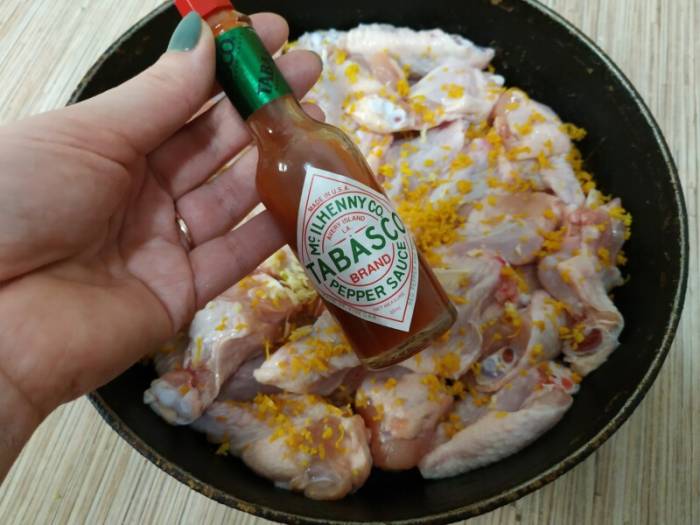 Табаско по вкусу. Получатся остренькие крылышки. Мы добавляем не более половину чайной ложки, на 1 кг. куриных крылышек. Если готовите впервые, не переборщите!