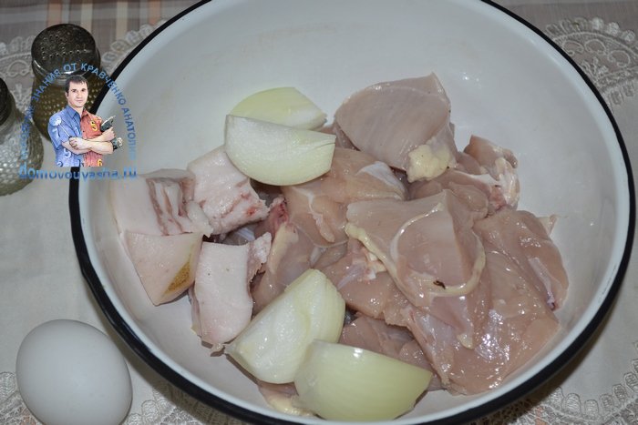 Куриное филе вымыла, обсушила и порезала кусочками. С сала срезала шкурку, порезала кусочками. Если любите, можно очистить пару зубчиков чеснока. Чеснок придаст аромат и вкус.
