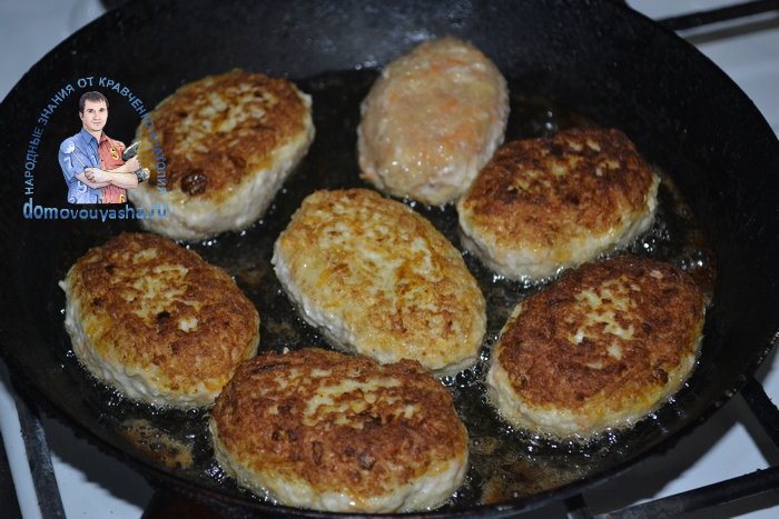 - Теперь черпаем фарш ложкой и опускаем его в горячее масло, обжариваем котлетки до готовности.