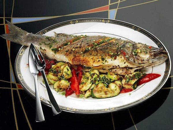 К столу жареный сибас обычно подаётся с овощным гарниром или салатом.