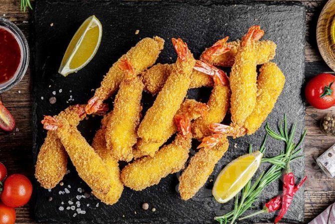Фото: Лангустины в панировке Морепродукты, панированные в сухарной крошке, выглядят красиво и аппетитно. Такое блюдо украсит любой праздник. В рецепте используется традиционный японский способ панировки.