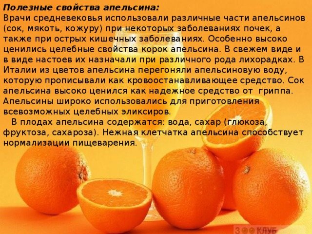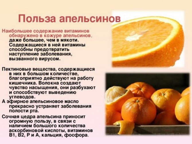 Апельсины богаты витаминами, микро- и макроэлементами, имеют углеводную и белковую структуру, насыщенные и ненасыщенные жирные кислоты, что делает их полезными для организма человека.