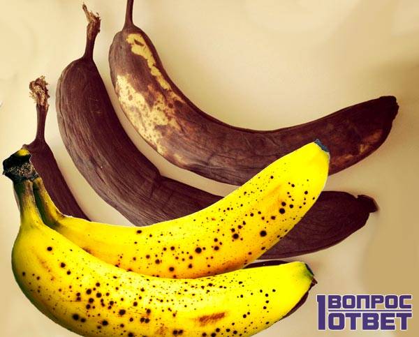 Наличие пятен на кожуре обозначает лишь очередной этап созревания банана. Сначала он зеленый, потом желтый, потом кожура покрывается коричневыми пятнами. На последнем этапе зрелости плод коричневеет или чернеет.