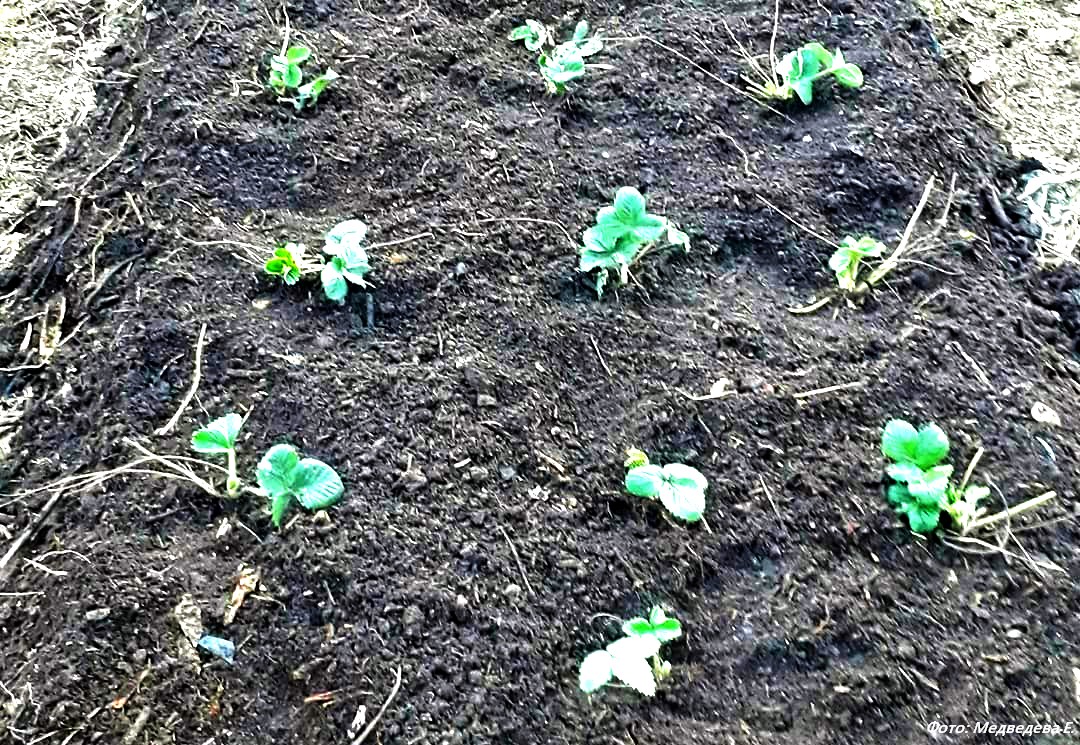 Для такой работы выбирают исключительно мощные розетки на усиках, которые ещё не начали укоренение. На грядку засыпают рыхлую почву с небольшим содержанием опилок и торфа. Следует обрезать усики таким образом, чтобы со стороны материнского куста оставался стебель с длиной приблизительно в 20 сантиметров. Наличие такого длинного стебля защитит молодое растение от высыхания. Высаживают рассаду таким образом, чтобы длинный стебель оказался над субстратом