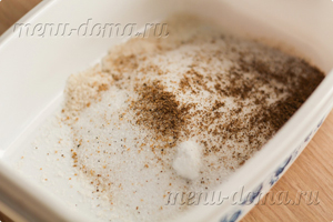 -2- Приготовьте смесь для засолки. Соль является натуральным консервантом, который надолго сохранит наш домашний деликатес от порчи. Также она поможет избавиться от «хитрющих» паразитов. Смешайте соляные кристаллы крупного помола с таким же грубо молотым черным перцем. Можно добавить и несколько столовых ложек мягкого коньяка. Перемешайте. Кстати, вкусной получается и вяленая куриная грудка. Готовится она практически так же, но есть свои тонкости. |