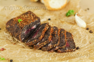 Готовое мясо легко нарезается на тонкие пластинки, оно не жесткое и эластичное. Хорошо подойдет в качестве самостоятельной закуски, как добавка на бутерброды или в салаты.