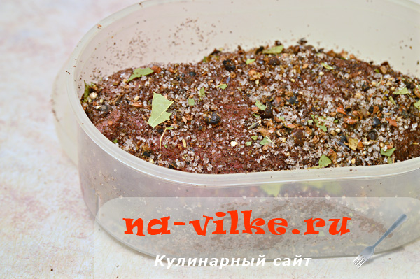 - Достаем мясо, обсушиваем его на ветру или при помощи вентилятора. Убираем с него лишнюю соль, опять кладем в широкую емкость и тщательно обмазываем приготовленной смесью из приправ. Толщина обмазки должна быть от 0,5 до 1 см. Закрываем посуду пищевой пленкой и ставим в холодильник на сутки.