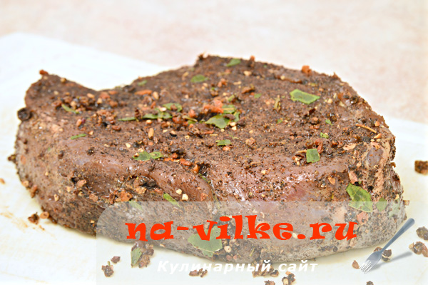 - Вымоченную в уксусе свинину достать, стряхнуть излишки воды, но не обсушивать! Влажный кусок обмакнуть в специи со всех сторон так, чтобы кусок был надежно и полностью покрыт ароматным слоем.