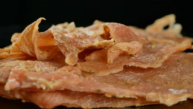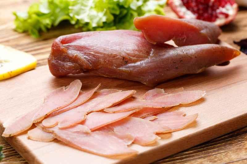- Вялят обычно говяжью вырезку, свиную шею, филе индейки, утки или курицы.