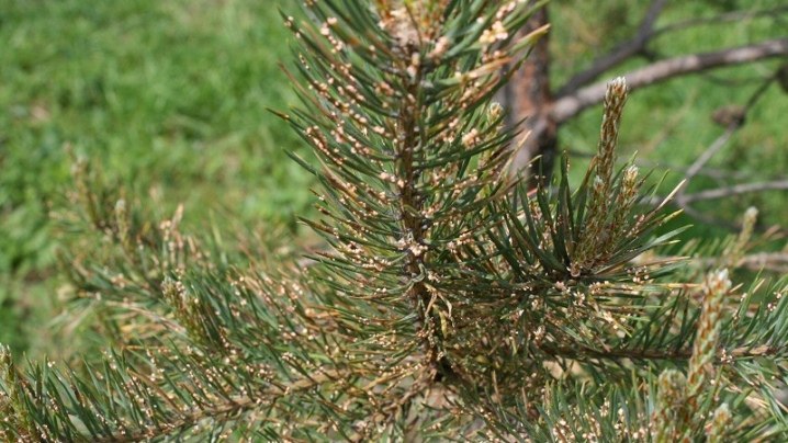 - изменение внешнего вида хвои и веток – пожелтение (например, при ржавчине) или потемнение (некроз);
