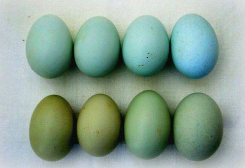 Голубые и зеленоватые куриные яйца Итак, достаточно просто посмотреть на курицу и цвет ее оперения, чтобы понять, какого цвета яйца она будет нести. Если перья белые, и мочки ушей тоже не пигментированы, то и скорлупа будет белесая или очень светлая. Если же перья коричневые или красноватые, а уши красные, то курица отложит только темные, бежевые яйца.