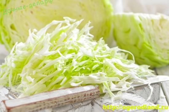 Из капусты сначала удаляют кочерыжку, а затем нарезают полосками примерно в полсантиметра-сантиметр (если нет других указаний в рецепте).