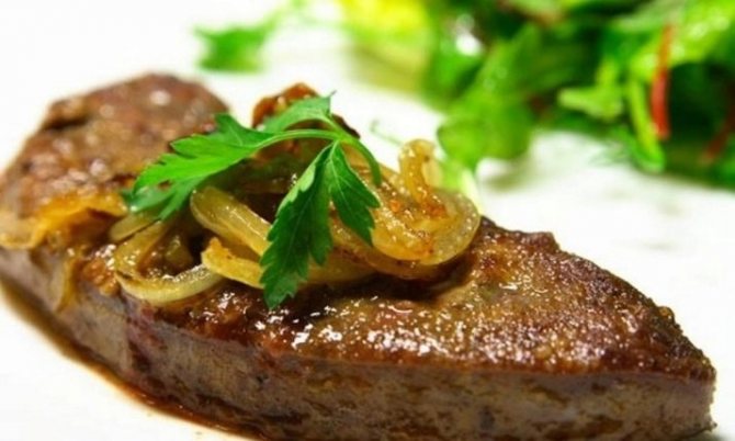 - Запекать печень лучше в форме отбивных. Далее, если есть желание, можно обжарить продукт на масле до получения румяной корочки. Но процесс обжаривания не должен превышать 1 минуты с одной и другой стороны.