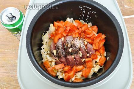 4. Пока мясо жарится, моем и очищаем все овощи и мелко режем, выкладываем их в мясо, заливаем светлым пивом.