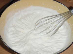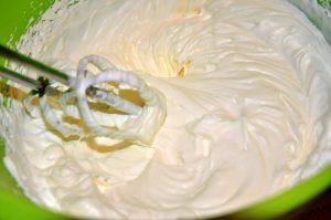 После того, как все составляющие будут достаточно холодными, наливаем сливки в миску, включаем миксер и начинаем взбивать, постепенно увеличивая скорость. Если у вас ручной миксер, не забываем вращать миксером, осуществляя круговые движения по ходу вращения венчика.