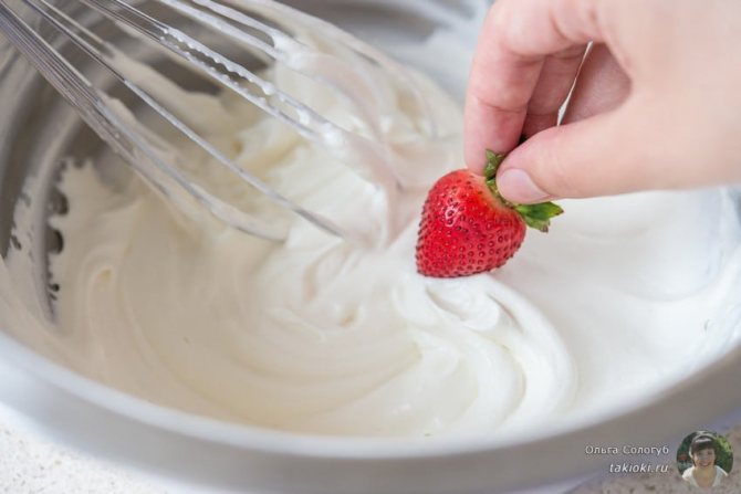 Для взбивания можно выбрать любой удобный для вас способ. Перед добавлением белка, сливки взбиваем до воздушной пены и добавляем белок. Взбиваем несколько минут до густоты и однородной текстуры.